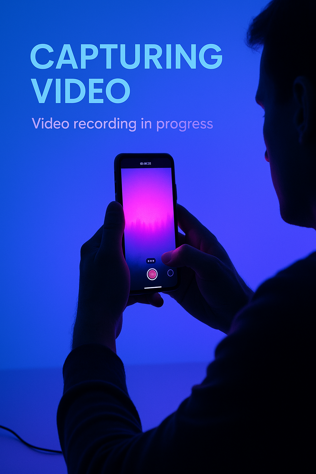 A person holding a smartphone recording video against a solid blue background. The phone emits a vibrant neon pink glow, illuminating the scene and creating a cool atmosphere.