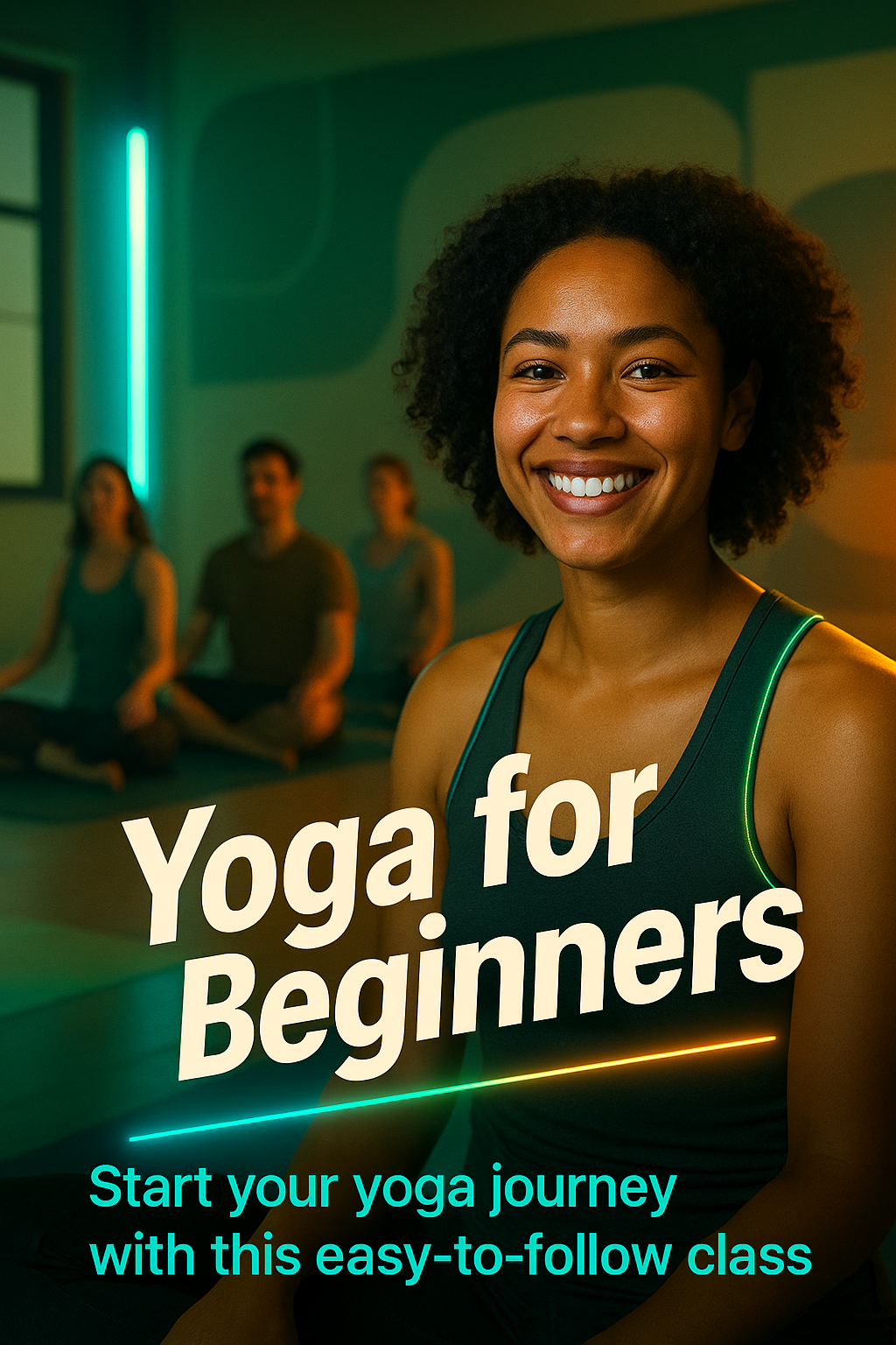 /Collection: /by davooda/Type: PNG/A vibrant promotional image showcasing a yoga class suitable for beginners, featuring a smiling instructor and a calming studio environment. This image is ideal for social media marketing or class advertisements.