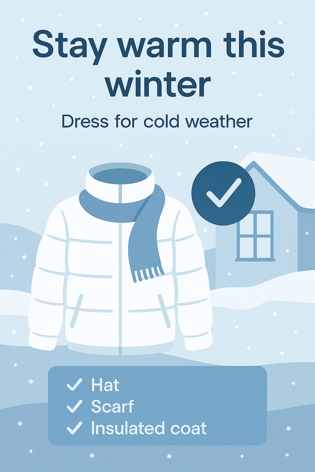 Informative graphic illustrating essential winter clothing items with a minimalist design, aimed at educating viewers on appropriate attire for cold weather conditions.