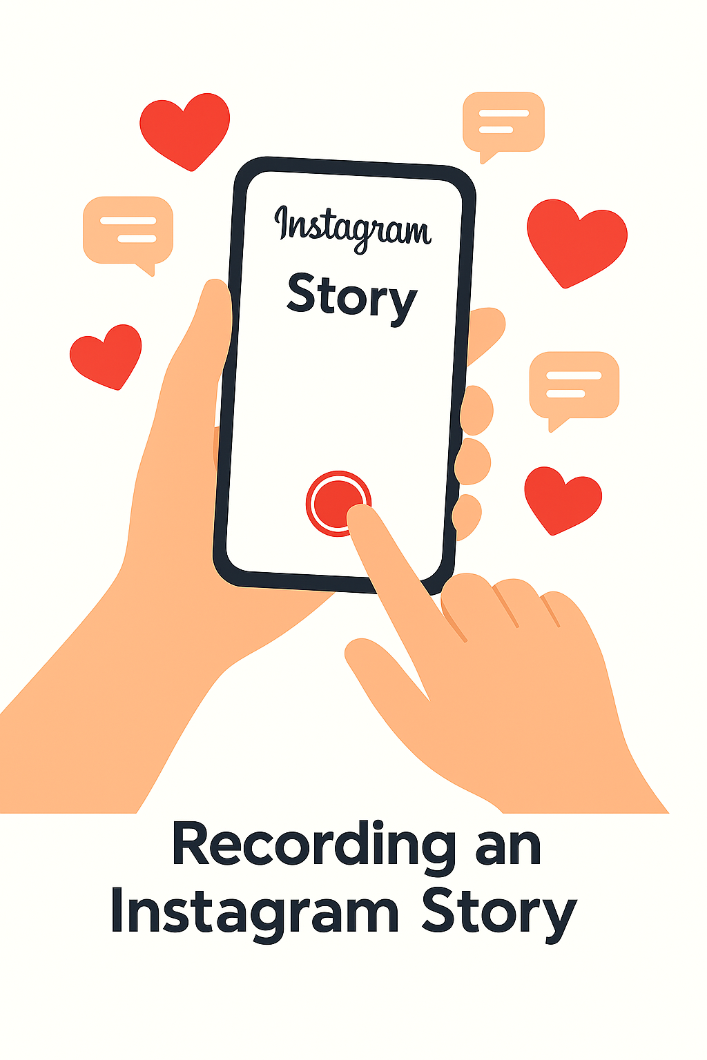 /Collection: /by davooda/Type: PNG/A vibrant digital illustration depicting a hand recording an Instagram story on a smartphone, surrounded by heart and comment icons. Ideal for social media guides or tutorials.