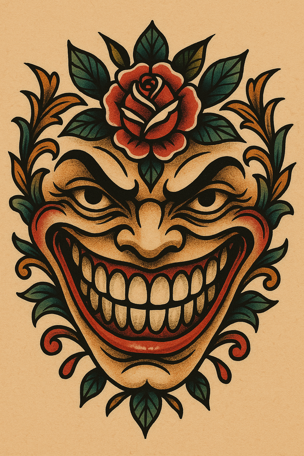 Vibrant Tattoo Design Featuring a Smiling Mask and Floral Elements