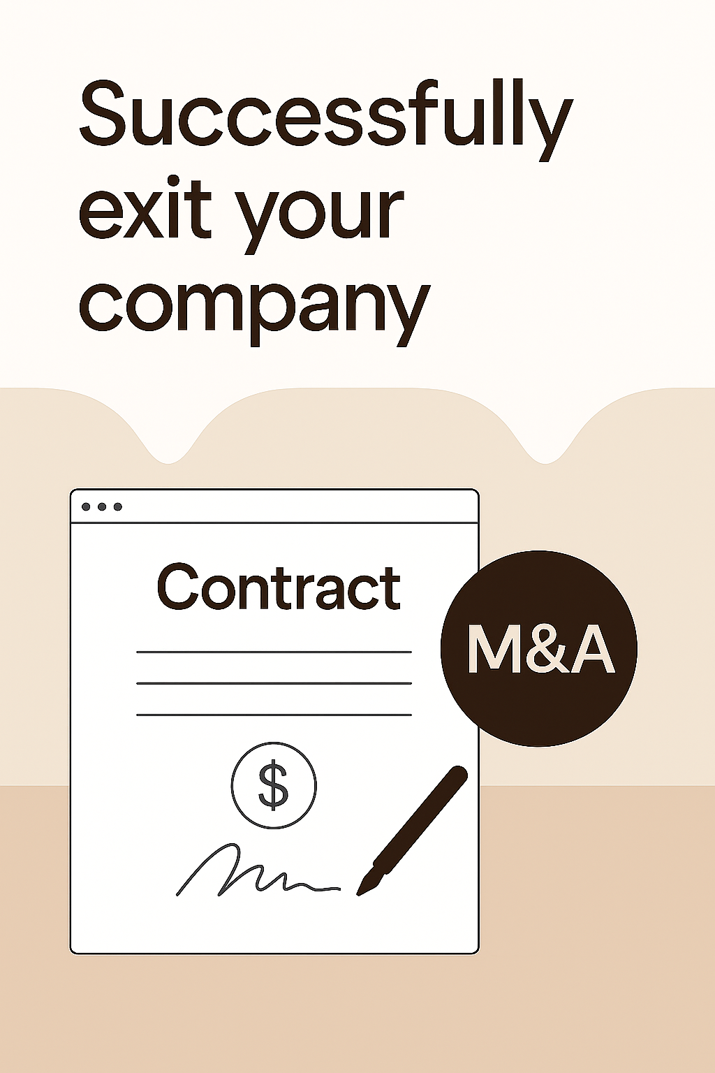 A minimalist graphic illustrating the concept of successfully exiting a company through a contract. The design elements include a document with a signature and financial symbol, suitable for business presentations.