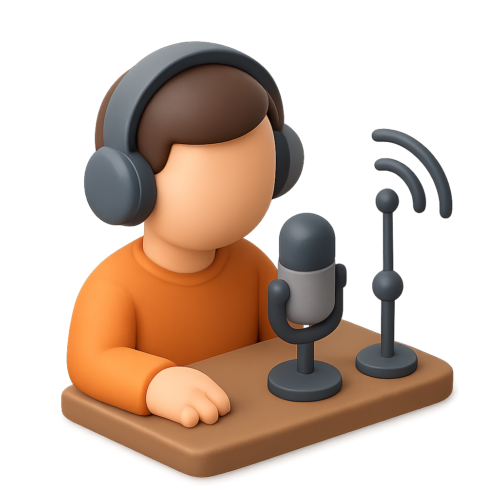 /Collection: /by davooda/Type: PNG/A simple 3D icon depicting a radio host with headphones, speaking into a microphone. The design features a three-quarter view with a warm color palette and a transparent background.
