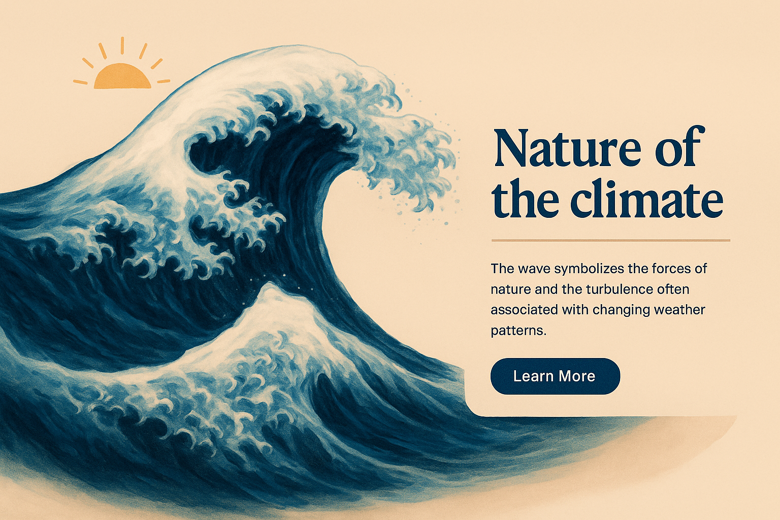 A captivating illustration of a large storm wave in deep blue, paired with a sun. The design emphasizes the forces of nature and climate change, with engaging text elements.