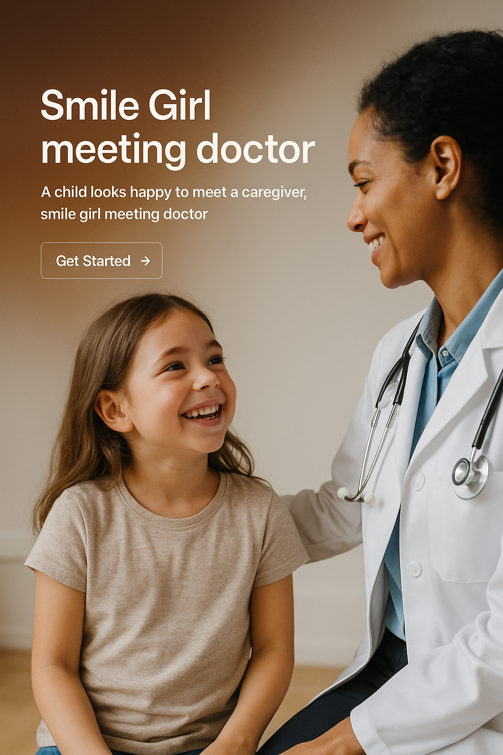 A happy girl smiles while meeting her caregiver, a doctor in a white coat. The warm interaction captures a moment of care and comfort.