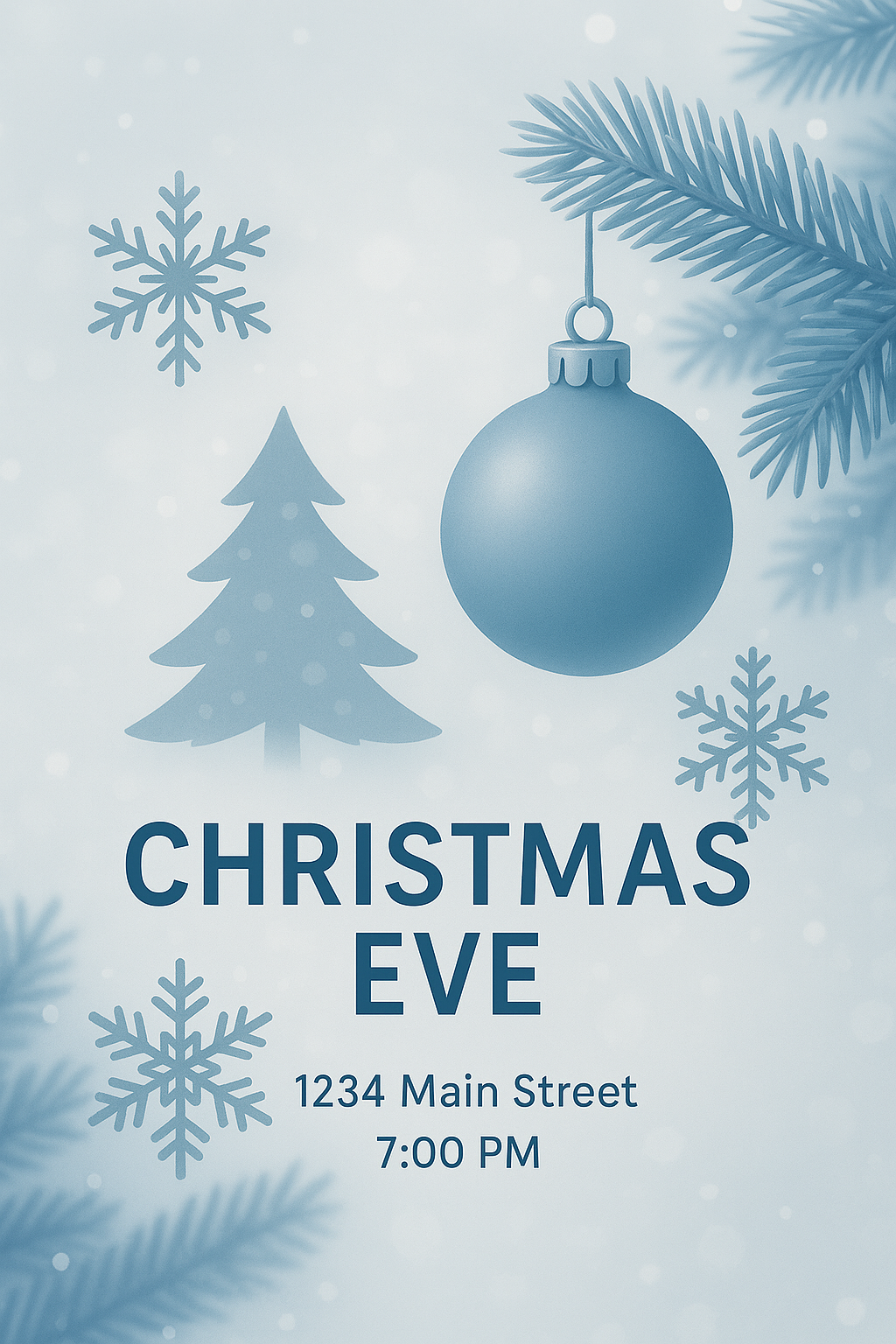 Stylish invitation graphic for Christmas Eve featuring soft blue tones, snowflakes, and a Christmas tree ornament, ideal for festive gatherings.