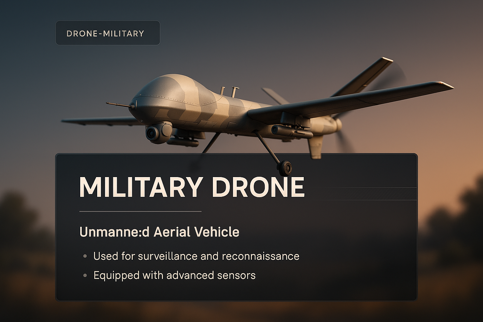 /Collection: /by davooda/Type: PNG/A 3D illustration of a military drone, featuring a sleek design with a gradient background and informative text blocks integrated into the image. The drone is depicted in its operational environment.