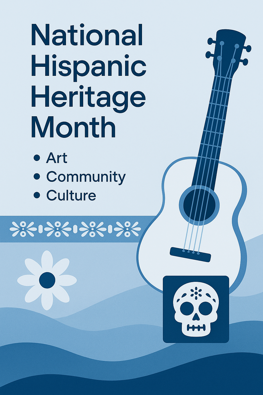 /Collection: /by davooda/Type: PNG/A visually appealing graphic celebrating National Hispanic Heritage Month, featuring a guitar and cultural symbols, ideal for community events and educational promotions.