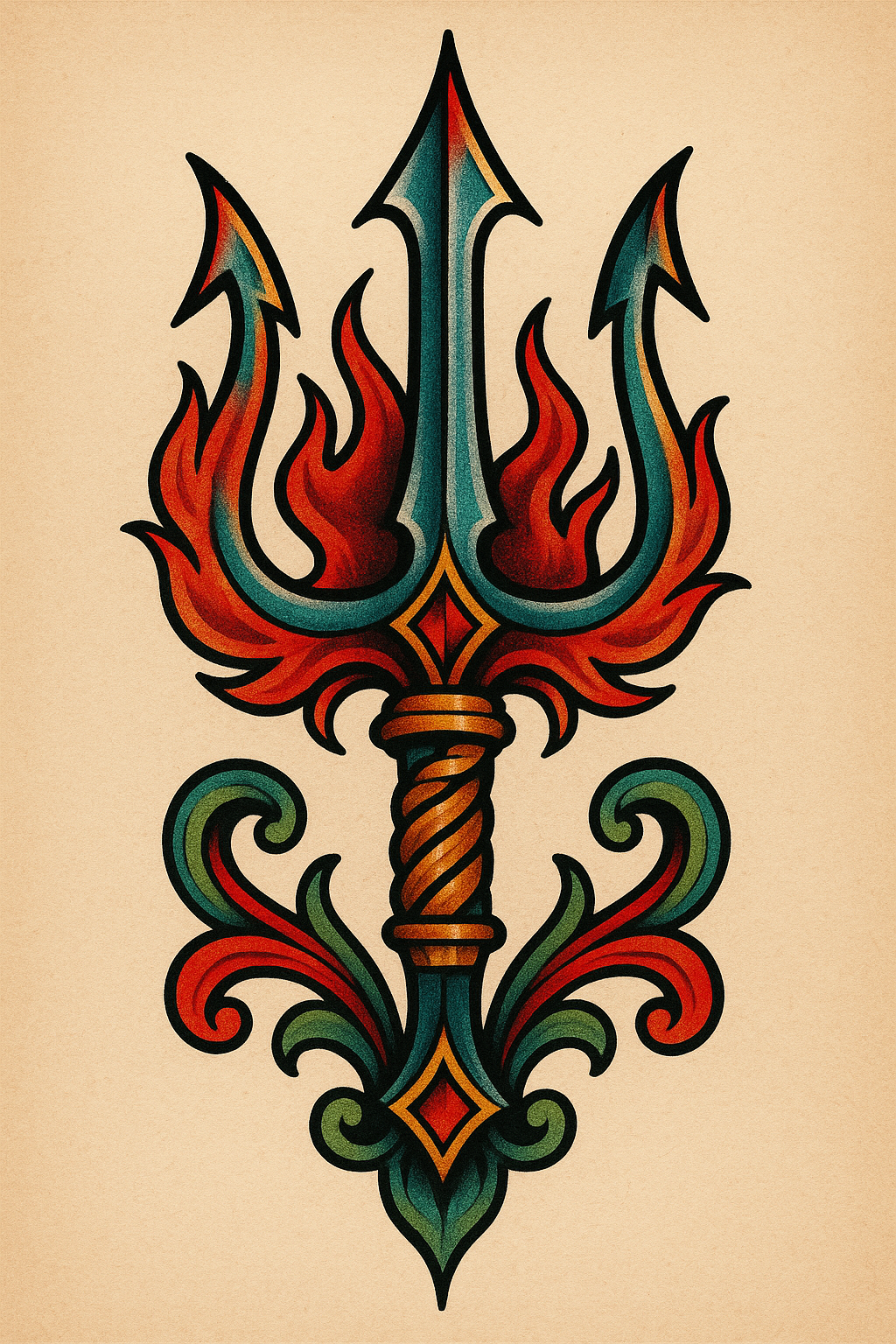 This image features a vibrant tattoo-style illustration of a trident surrounded by flames and decorative elements. Ideal for graphic design or tattoo inspiration.