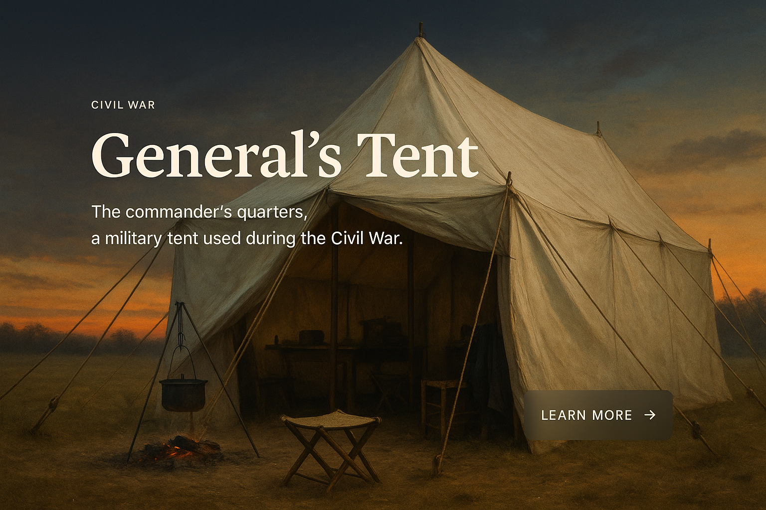 /Collection: /by davooda/Type: PNG/A realistic depiction of a general's tent from the Civil War, showcasing its interior with period-appropriate furnishings. The setting is enhanced by a gradient sky.
