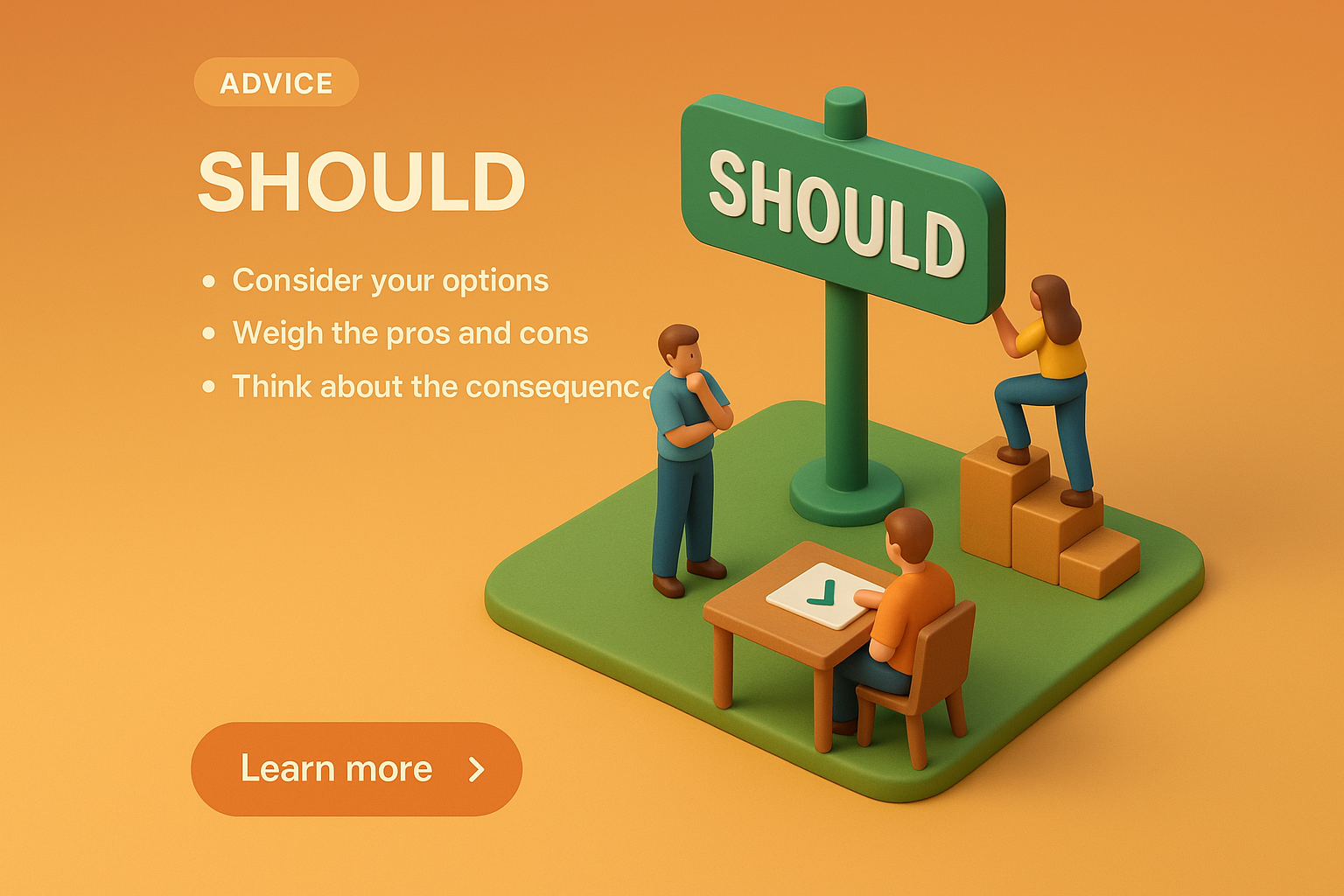 /Collection: /by davooda/Type: PNG/A vibrant 3D illustration depicting a decision-making scenario with tiny characters interacting around a green sign labeled 'SHOULD'. The scene is set against a smooth gradient background.