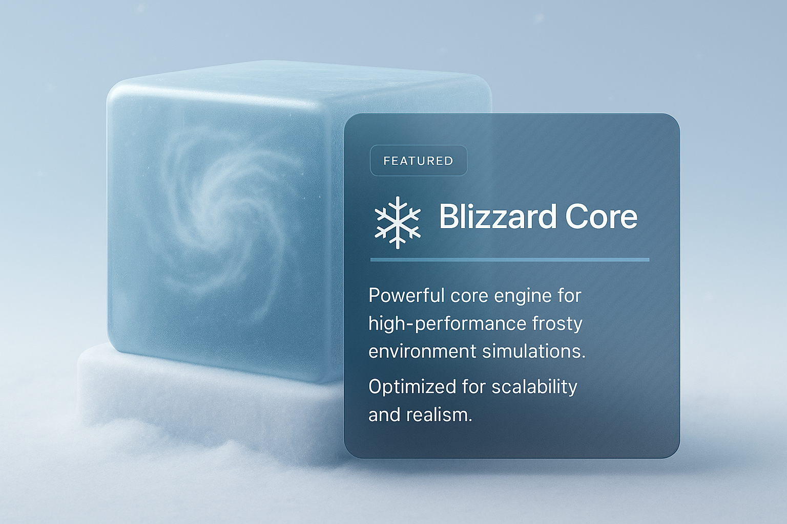 /Collection: /by davooda/Type: PNG/A visually striking 3D design featuring a frozen cube with swirling patterns, accompanied by a sleek information panel highlighting the Blizzard Core's features, all on a soft gradient background.