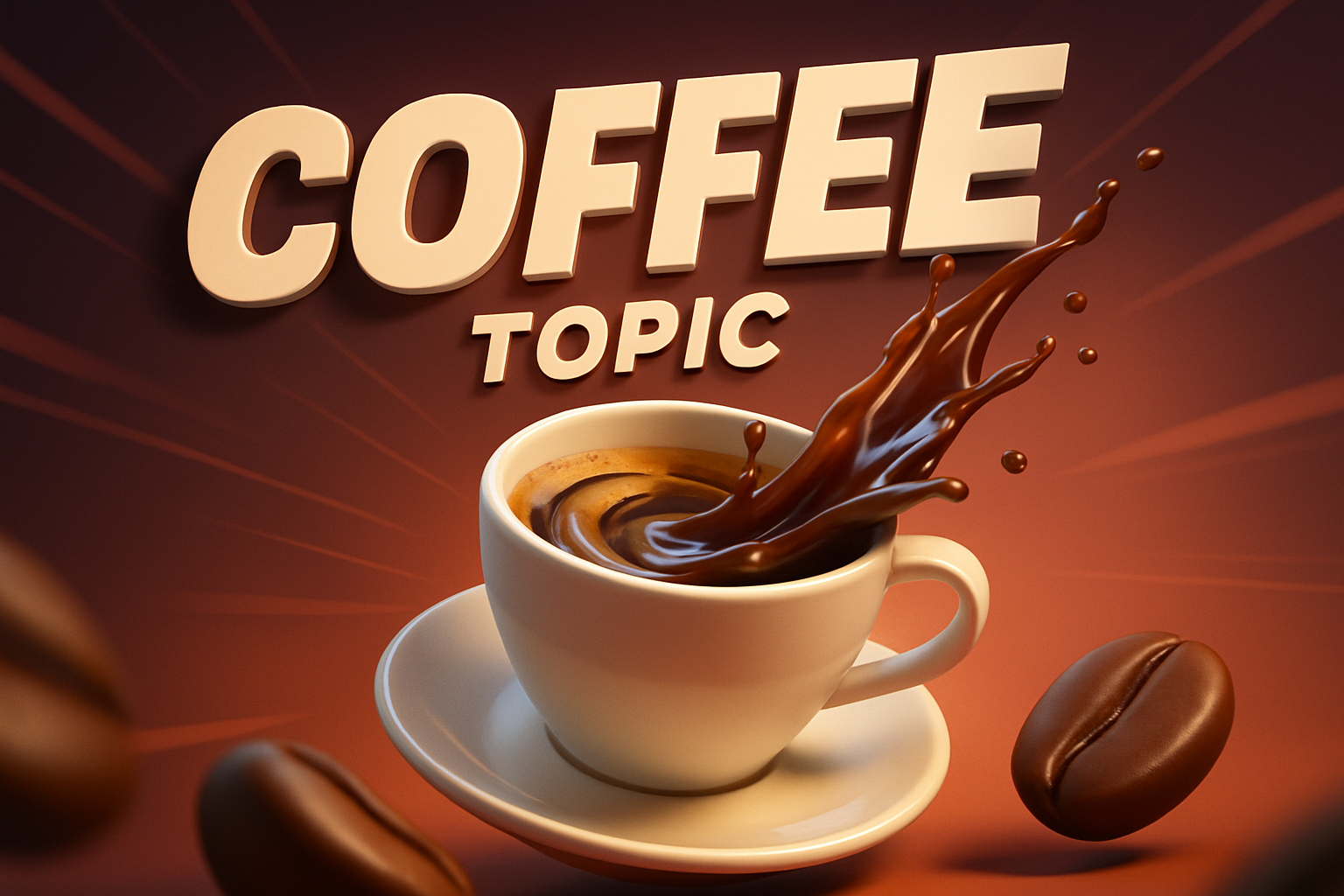 A visually striking 3D illustration of a coffee cup with a splash of coffee and beans, set against a smooth gradient background. The composition emphasizes dynamic movement and engaging colors.