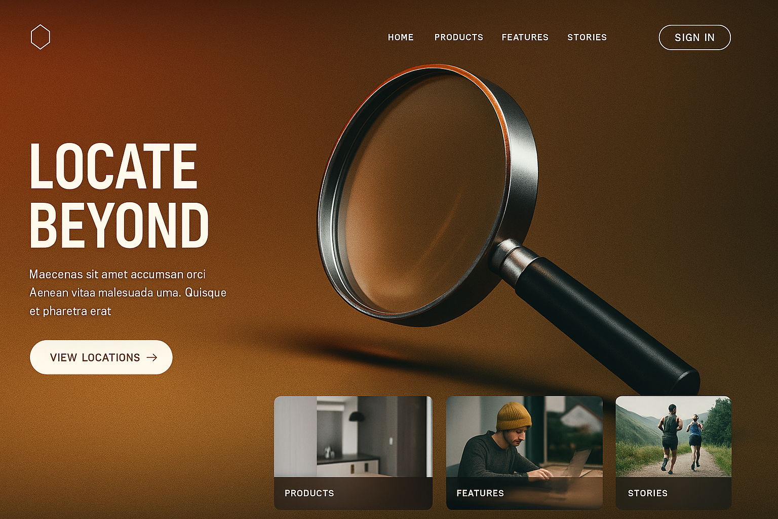 /Collection: /by davooda/Type: PNG/A vibrant landing page design featuring a realistic magnifying glass on a gradient background. The layout includes sections for products, features, and stories, with a small sans-serif font.