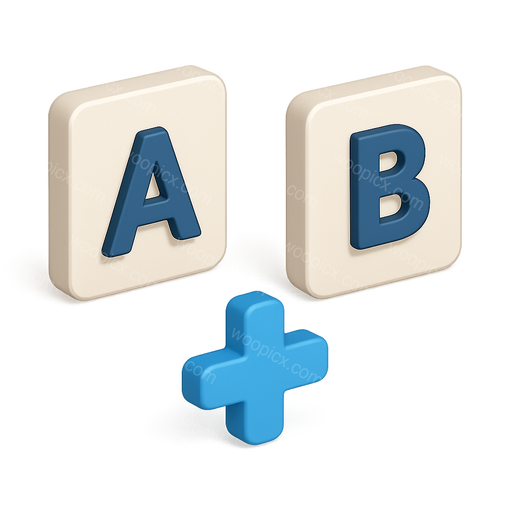 Two 3D cards displaying the letters A and B, with a glowing blue plus sign in the center. The cards have a soft, isometric design with a transparent background.