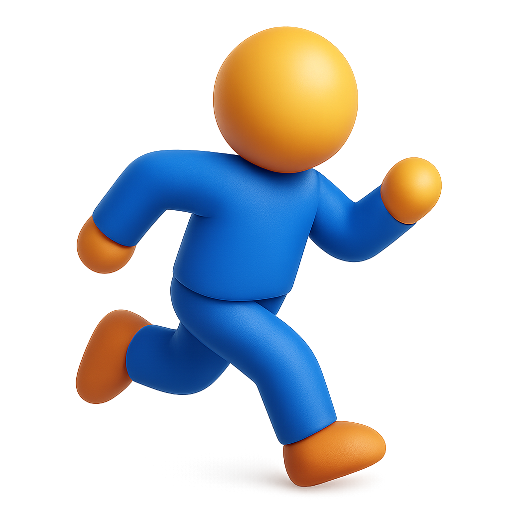 A stylized 3D figure in mid-run, featuring an orange head and blue body. The figure is in a three-quarter view with a transparent background, emphasizing a playful design.