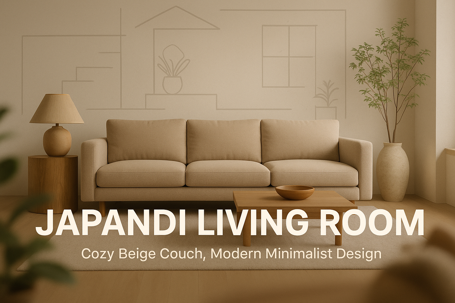 Stylish interior design image featuring a cozy beige couch in a minimalist Japandi living room, perfect for home decor inspiration.