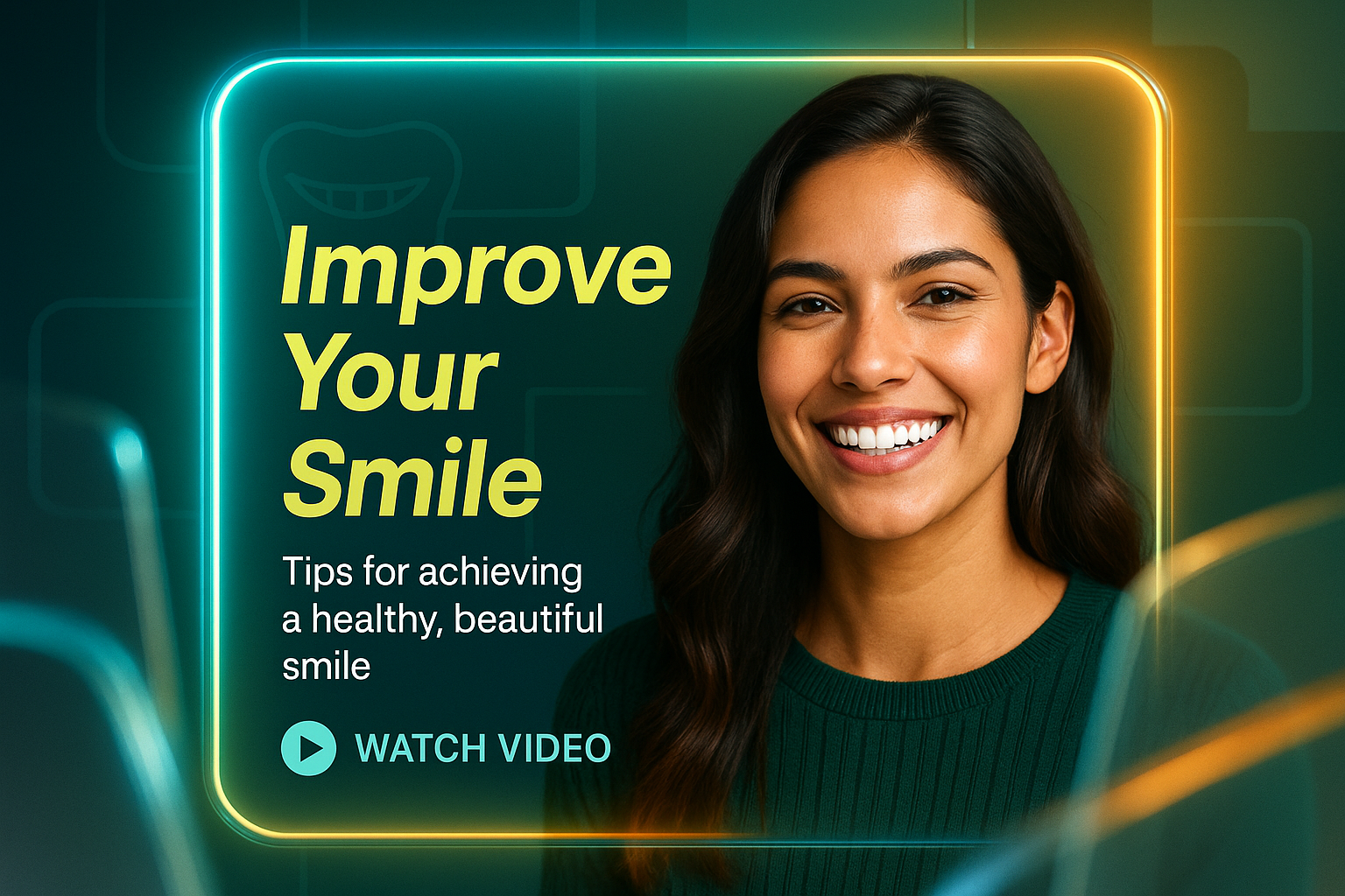 Vibrant promotional graphic featuring a smiling woman, designed to attract viewers to a video about dental health tips. The modern design uses bright colors and a friendly tone.