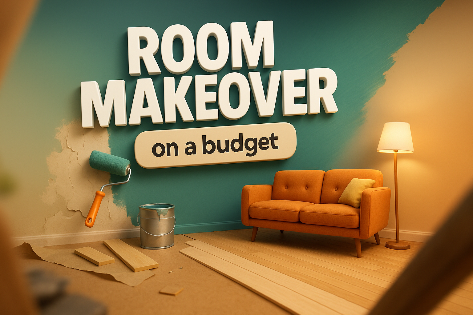 This graphic represents a room makeover theme, showcasing a budget-friendly renovation concept. It features a modern design style with vibrant colors and a cozy atmosphere, ideal for home improvement content.