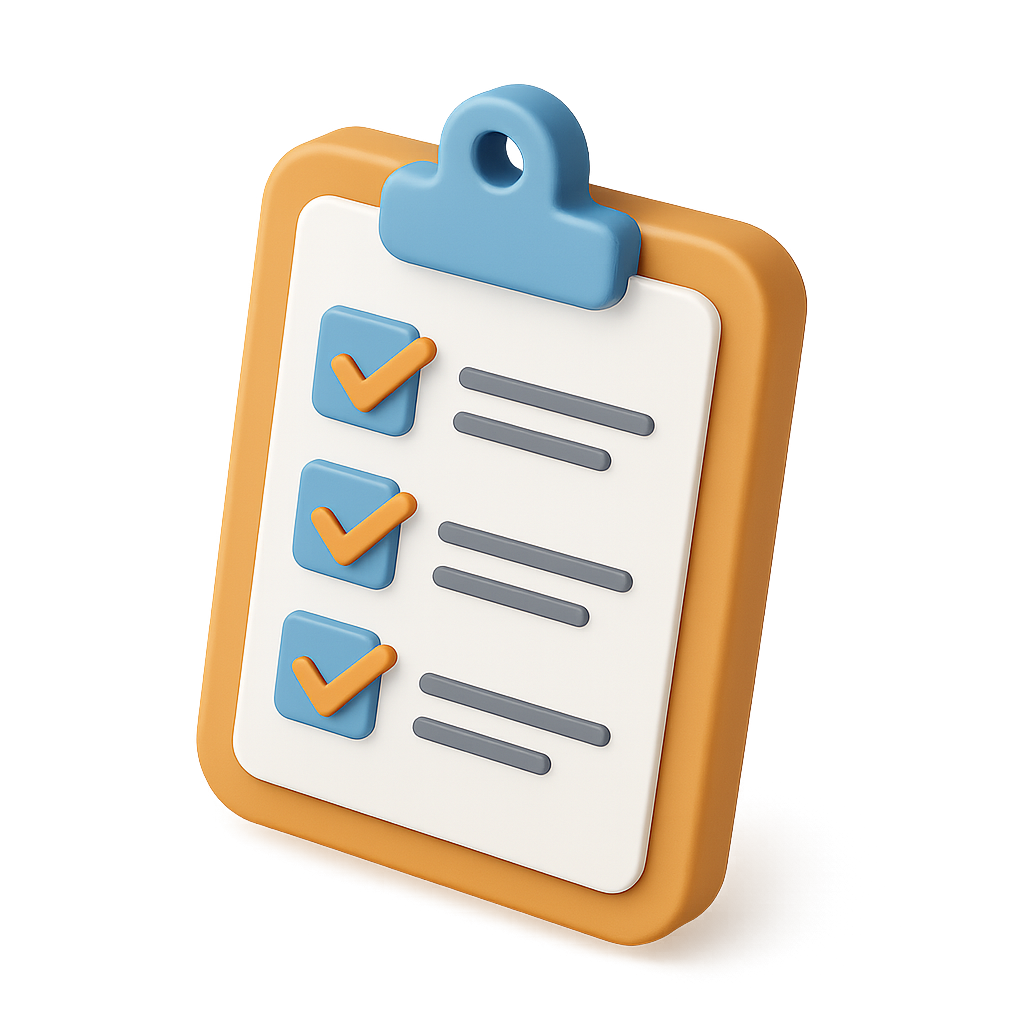 A vibrant 3D icon representing a clipboard with three checkmarks, depicted in a three-quarter view. The clipboard features an orange outline and a blue clip, set against a soft gradient background.