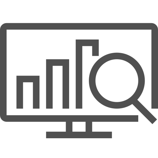 outline simple icon: analytics, charts, data analysis, magnifying glass, monitor