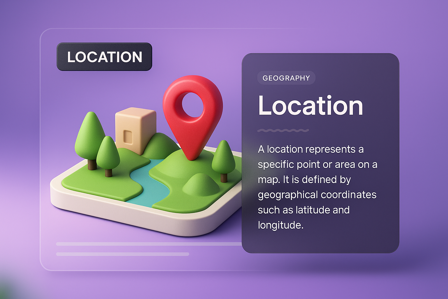 /Collection: /by davooda/Type: PNG/A 3D illustration showcasing a location map with a prominent pin. The design features layered elements, including a gradient background, natural scenery, and informative text blocks.