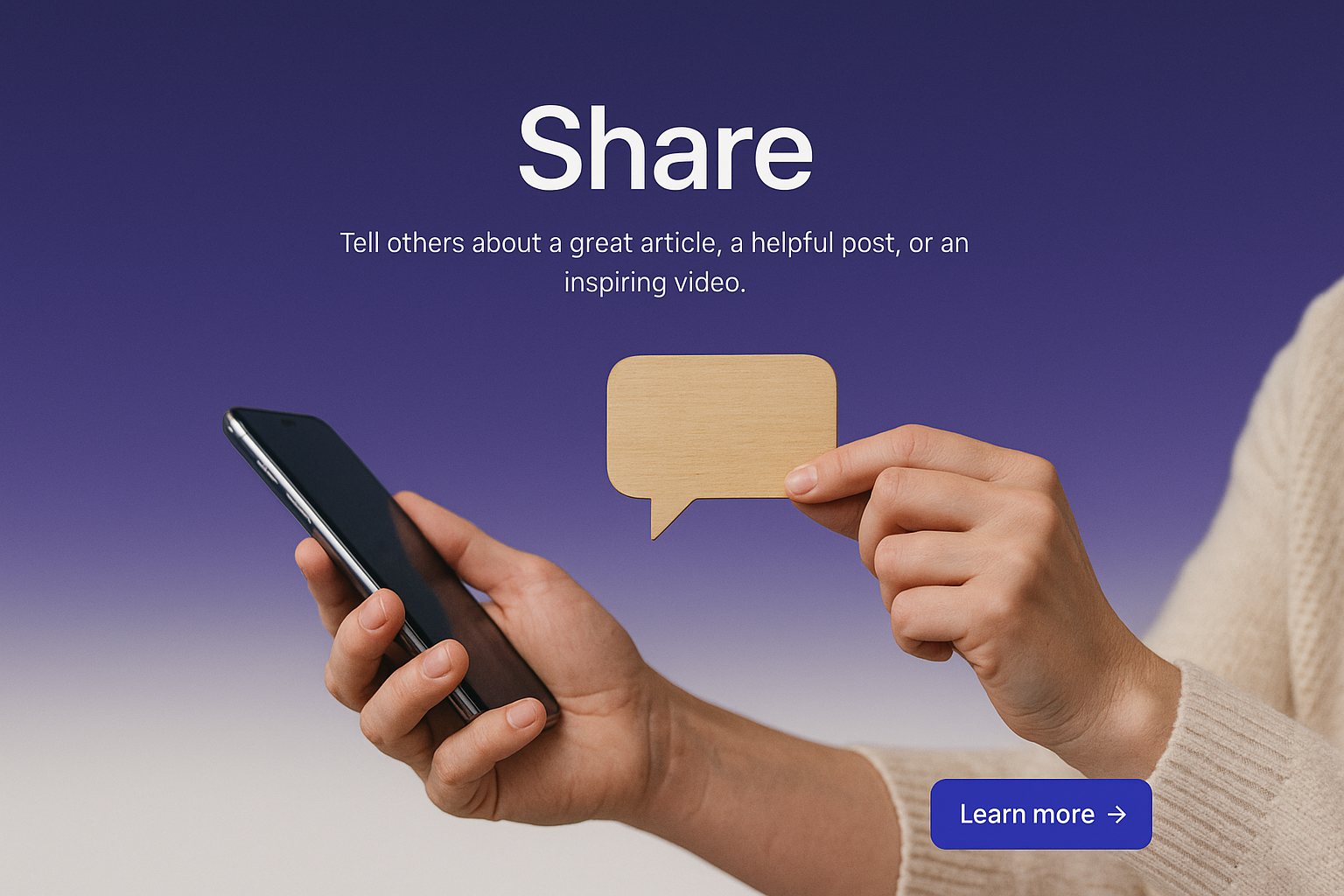 A stylish web page design showcasing the action to 'Share'. It features a gradient background, a hand holding a phone, and a speech bubble icon, emphasizing user engagement.