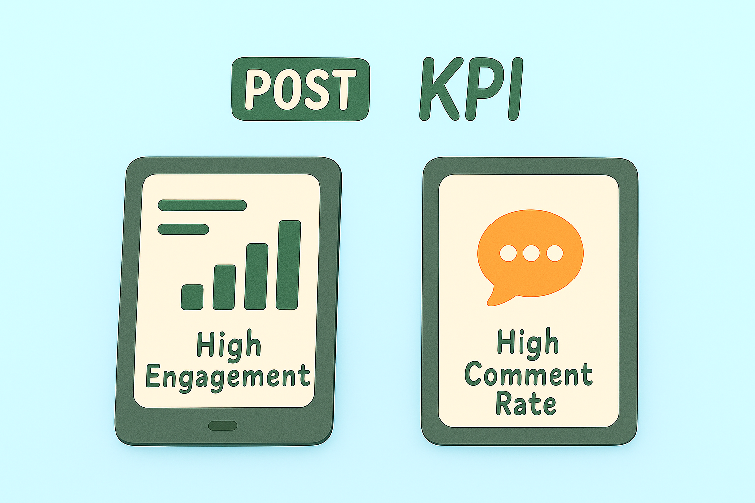 /Collection: /by davooda/Type: PNG/Informative graphic illustrating key performance indicators for social media posts, featuring stylized tablet visuals and engaging color scheme, ideal for digital marketing insights.