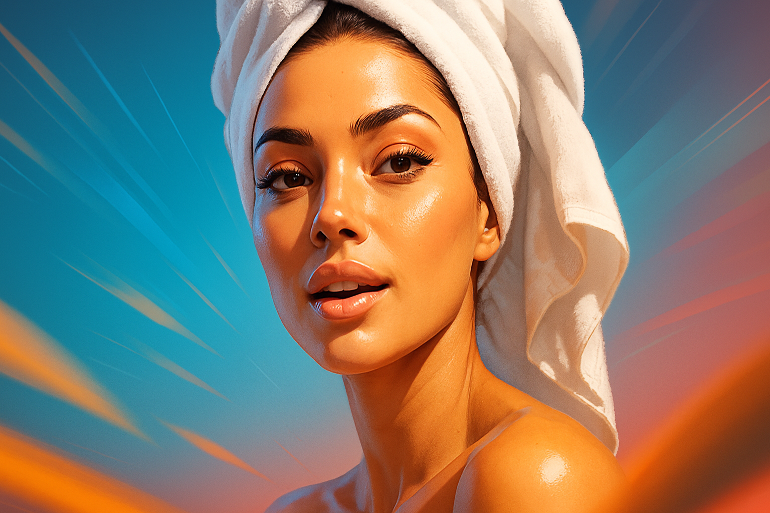This image features an attractive woman with a towel wrapped around her head, showcasing a vibrant background with dynamic lines radiating outward, emphasizing movement and energy.