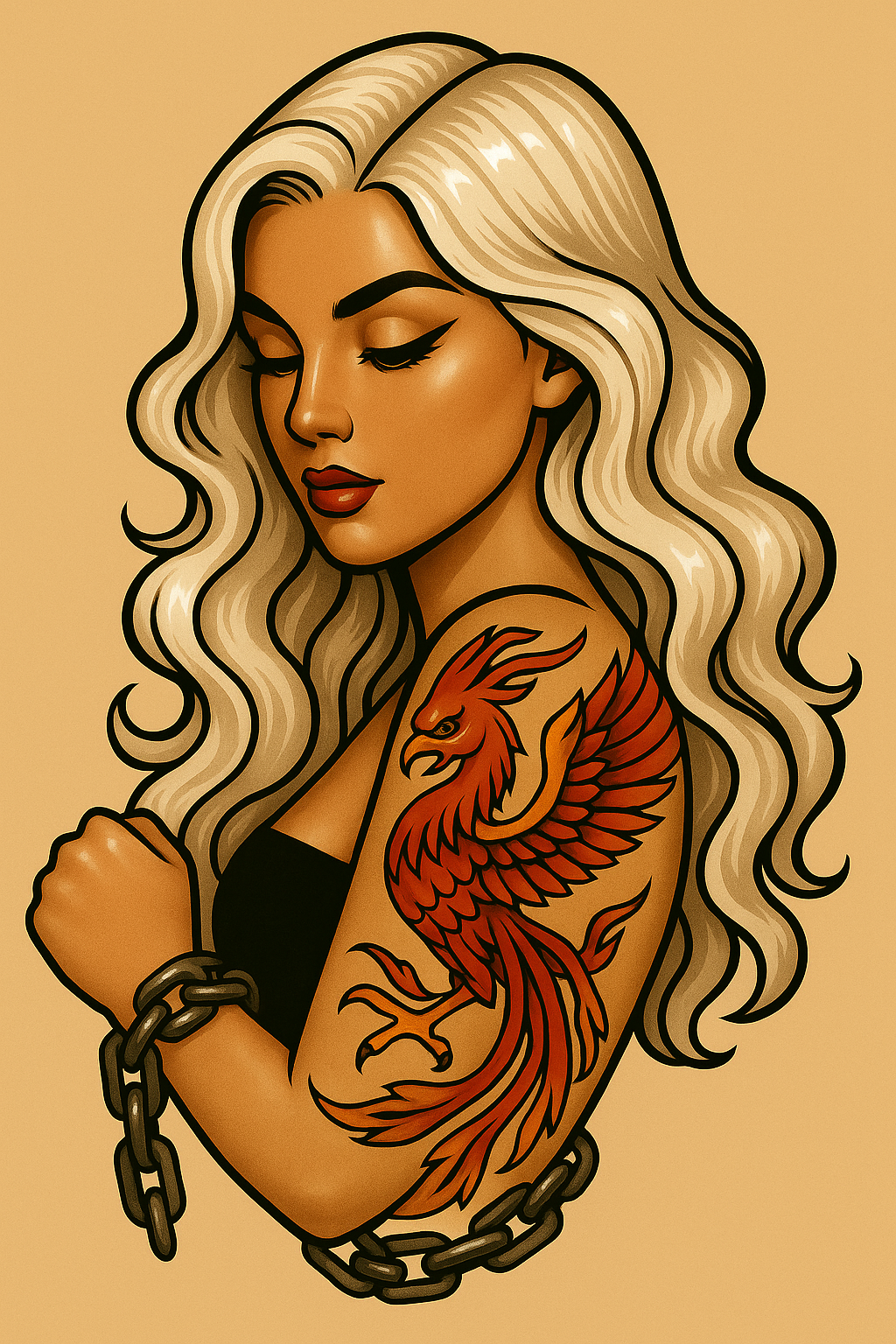 /Collection: /by davooda/Type: PNG/A stylized illustration of a woman with long, wavy blonde hair and a striking phoenix tattoo on her arm. She is depicted with chains on her wrists, set against a soft beige background, reminiscent of classic tattoo art with glossy anime-like highlights.
