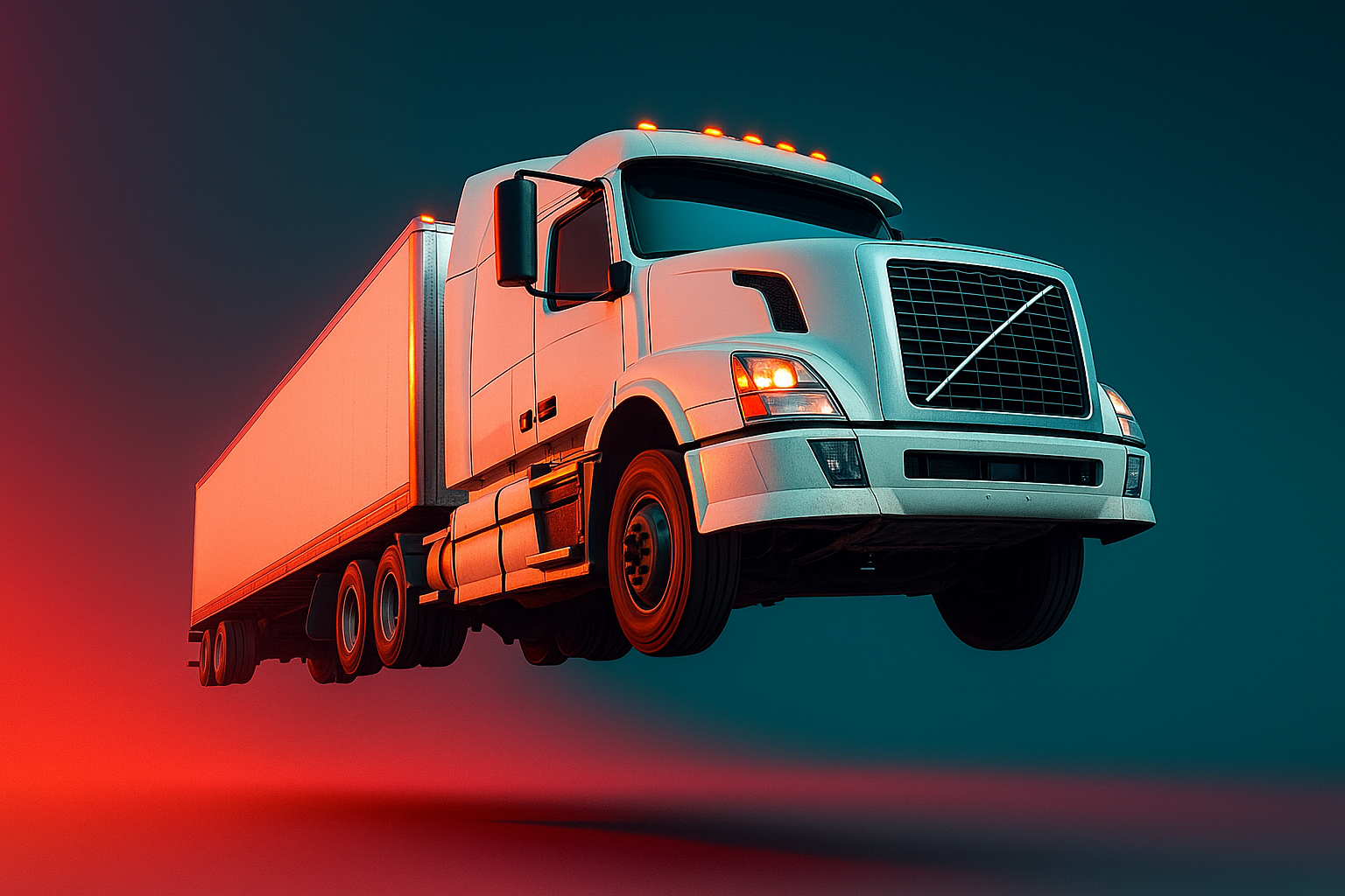 /Collection: /by davooda/Type: PNG/A realistic depiction of a white truck hovering in mid-air, illuminated by contrasting lights from both sides. The background features a smooth gradient, ensuring the truck stands out.