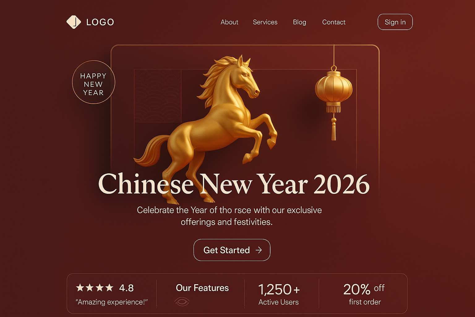 /Collection: /by davooda/Type: PNG/A visually appealing landing page design for Chinese New Year 2026 featuring a golden horse and lantern. The layout includes engaging blocks and a transparent glass effect.