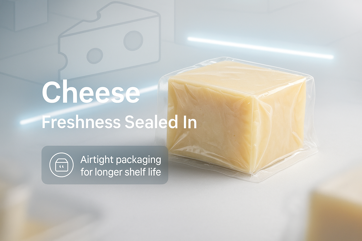 /Collection: /by davooda/Type: PNG/A modern product packaging image showcasing cheese in airtight packaging, emphasizing freshness and shelf life. The clean design and soft background highlight the product's appeal for food marketing.