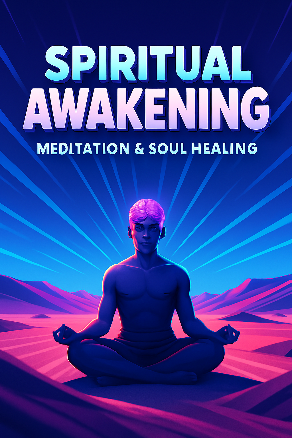 /Collection: /by davooda/Type: PNG/A vibrant illustration depicting a person meditating in the desert, embodying spiritual awakening and soul healing. The dynamic background features rays emanating from the center, enhancing the spiritual theme.