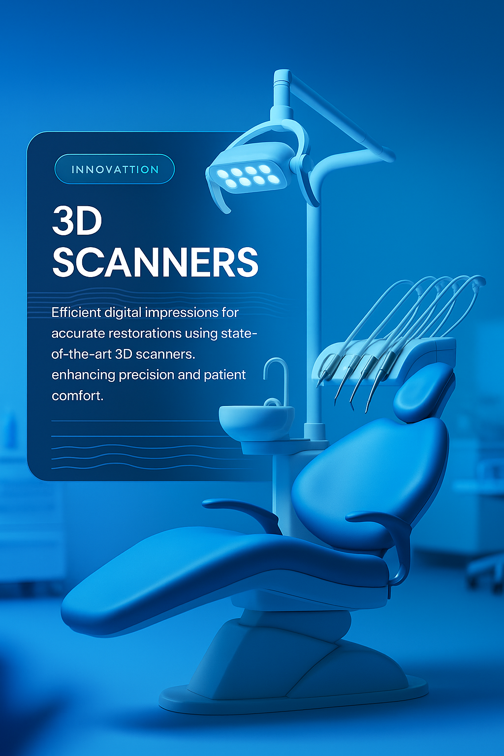 /Collection: /by davooda/Type: PNG/A sleek, modern dental clinic featuring a dentist chair and advanced 3D scanners. The image is illuminated by a soothing blue light, emphasizing innovation and patient comfort.