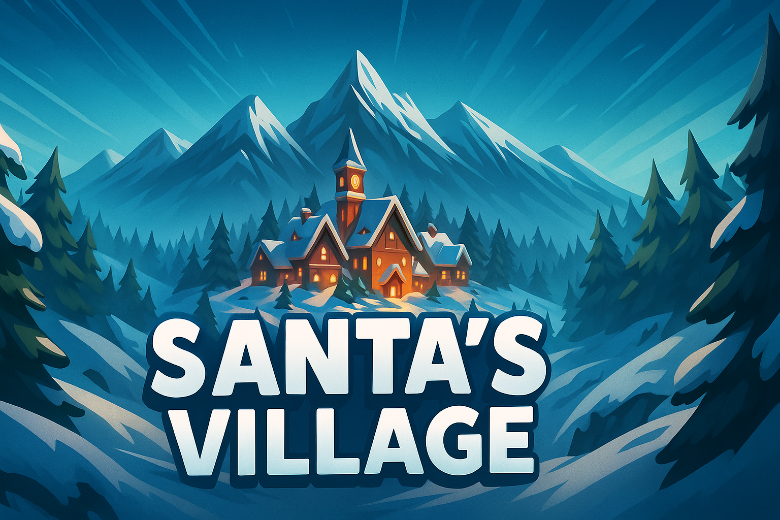Santa's Village Surrounded by Snowy Mountains and Christmas Trees