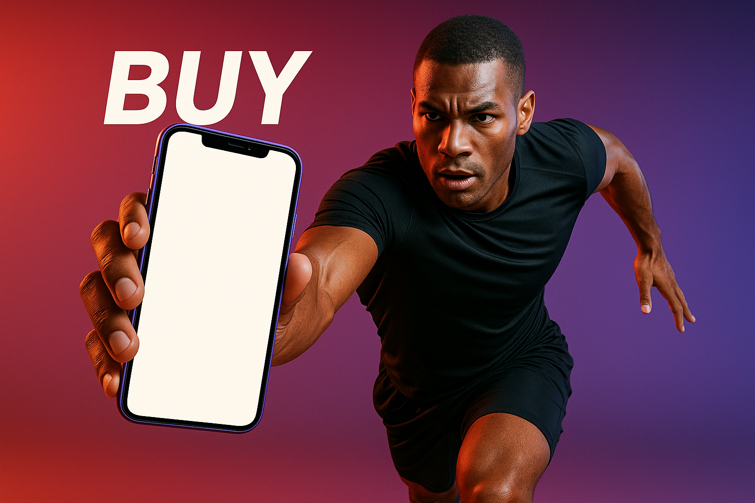 /Collection: /by davooda/Type: PNG/A dynamic scene featuring an athlete in an active pose holding a purple phone. The background showcases a vibrant gradient, enhancing the cinematic and futuristic mood.
