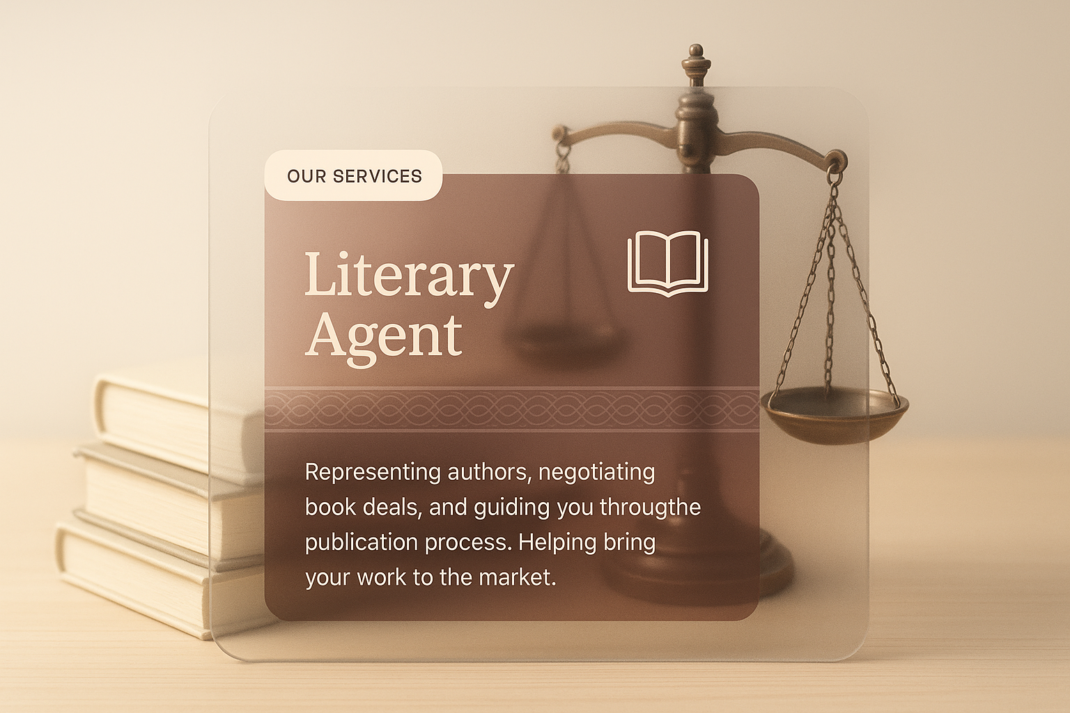 A modern web design mockup featuring a transparent overlay with text for literary agent services, surrounded by books and a scale symbolizing justice.