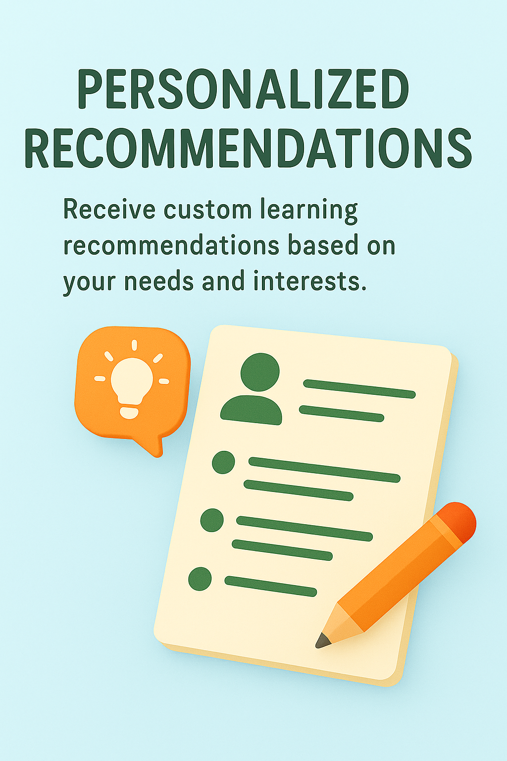 /Collection: /by davooda/Type: PNG/Illustrative graphic promoting personalized learning recommendations, featuring a notepad and a lightbulb icon, designed for educational platforms and digital marketing.
