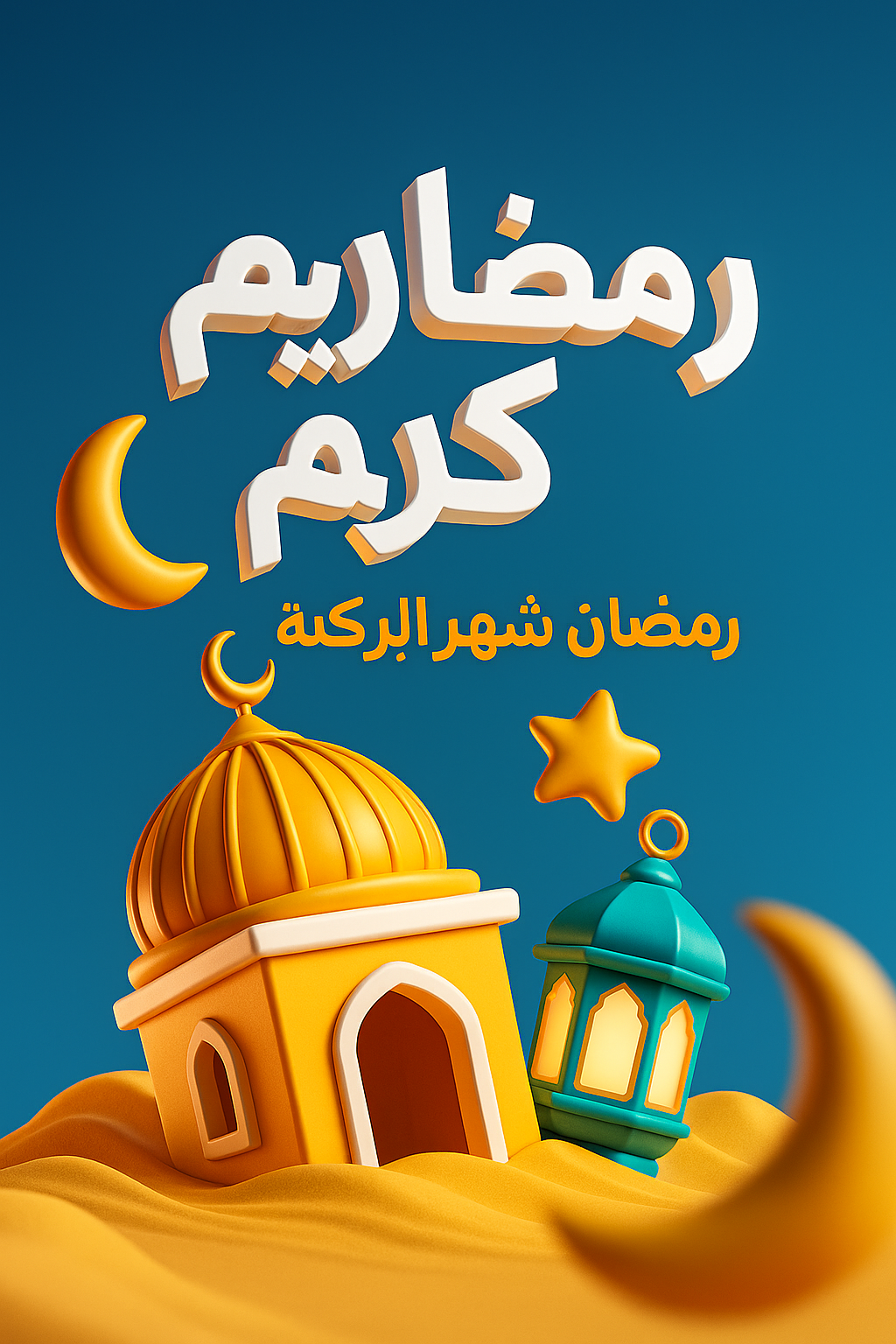 A vibrant 3D illustration featuring festive elements for Ramadan, including Arabic text and decorative motifs. The scene is designed with a smooth gradient background and layered composition.