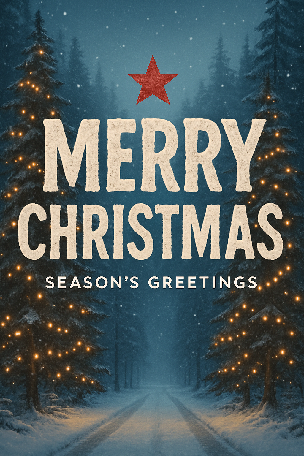 Charming Christmas greeting card design featuring a snowy landscape with illuminated trees, perfect for holiday celebrations and sending warm wishes.