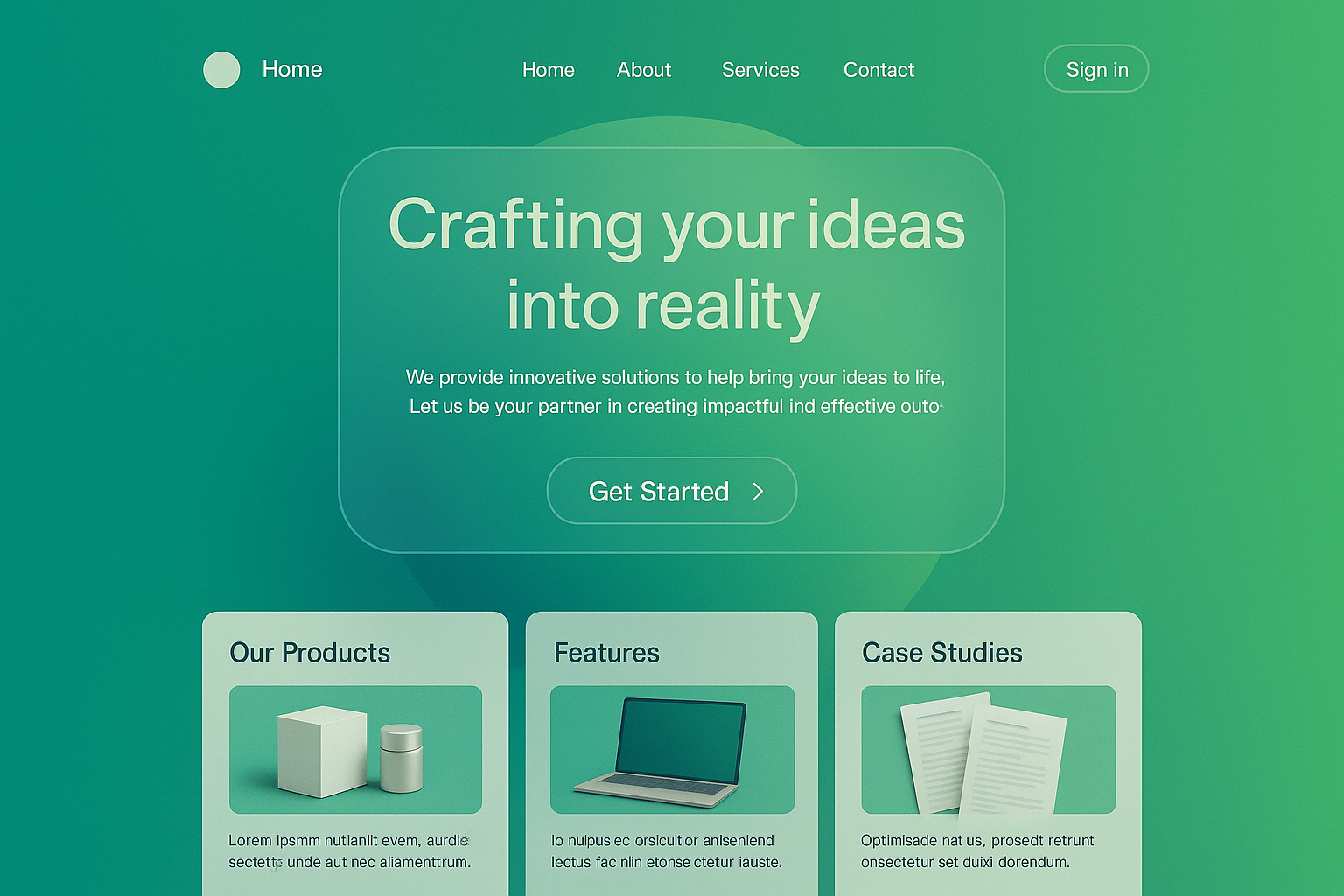 /Collection: /by davooda/Type: PNG/A sleek and modern landing page featuring smooth green and blue gradients. The design includes a prominent call-to-action button, layered glass panels, and sections for products and features.
