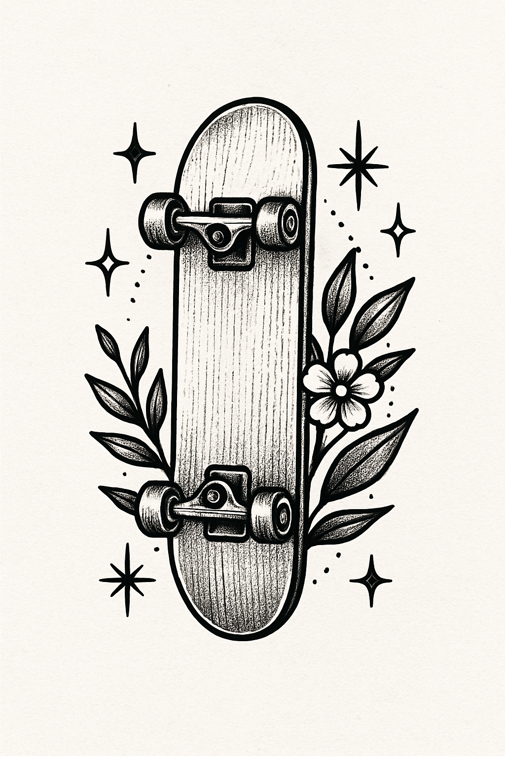 This image features a stylized illustration of a skateboard surrounded by floral elements and stars, ideal for skate culture or art enthusiasts.