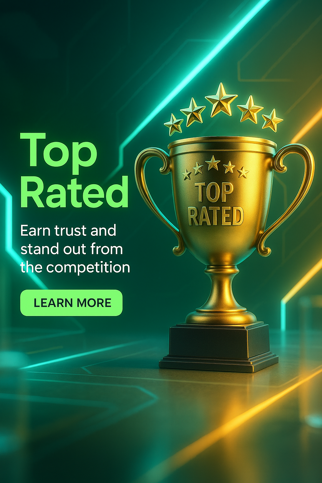 A visually striking promotional graphic featuring a golden trophy with a modern, high-tech background. Ideal for marketing campaigns emphasizing excellence and trust.