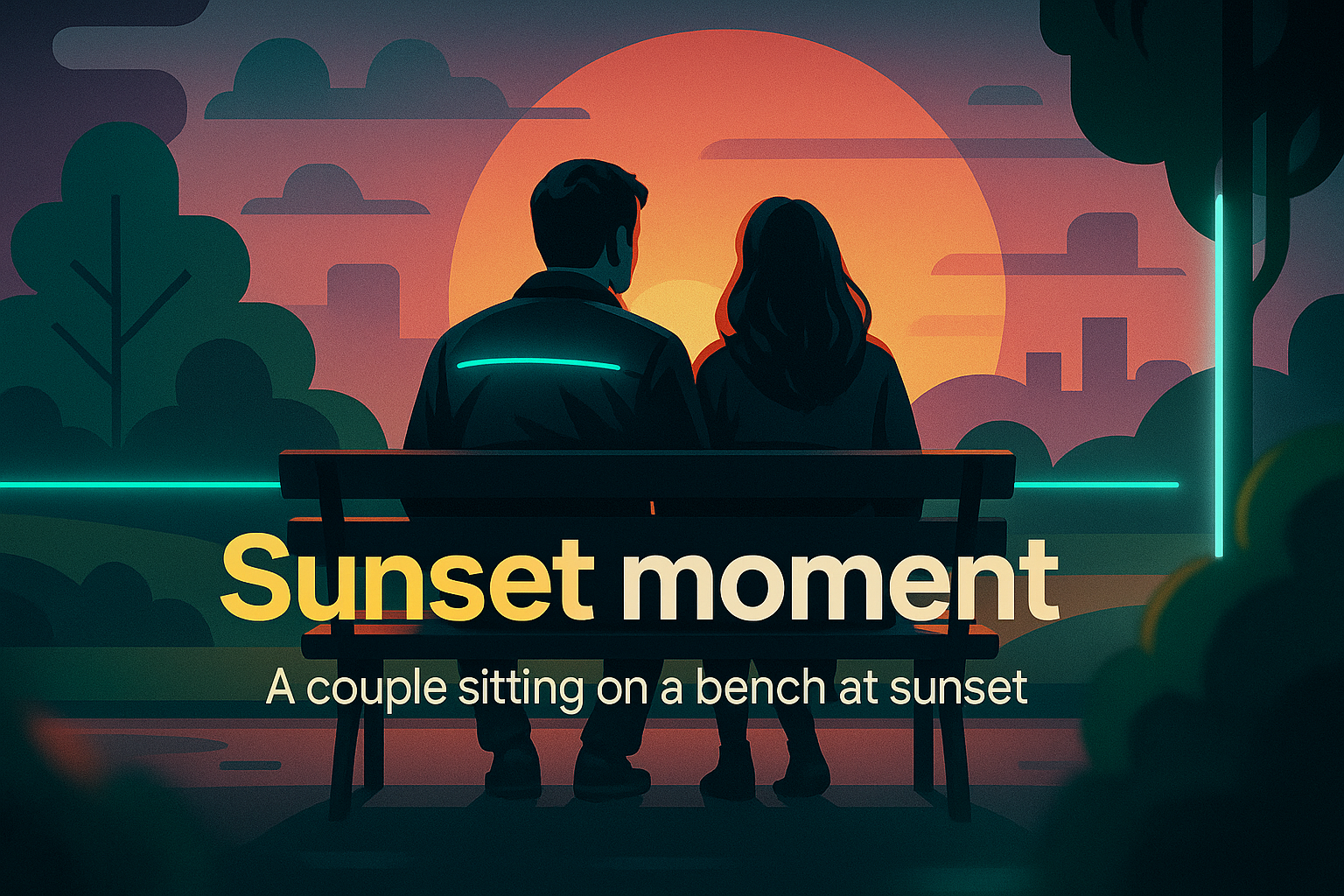 A beautifully illustrated scene depicting a couple sitting on a bench during sunset, featuring vibrant colors and a serene atmosphere, ideal for romantic themes.