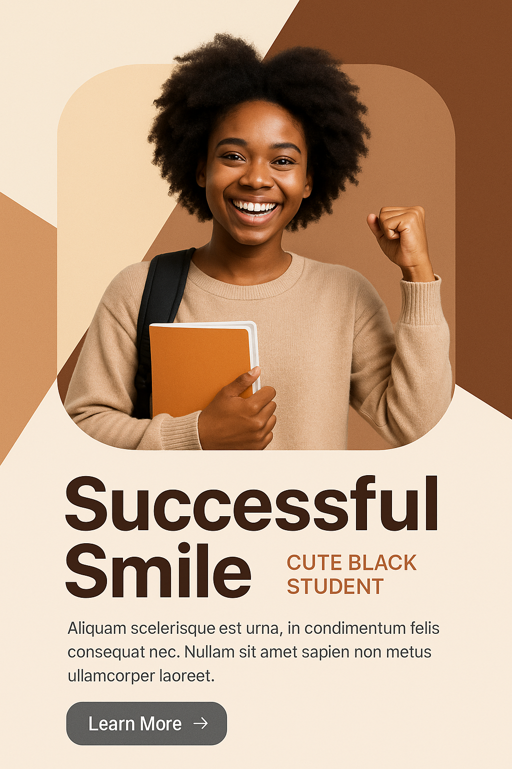 /Collection: /by davooda/Type: PNG/A cheerful black student smiles confidently while holding a book, set against a layered geometric background. The design includes a prominent call-to-action button.