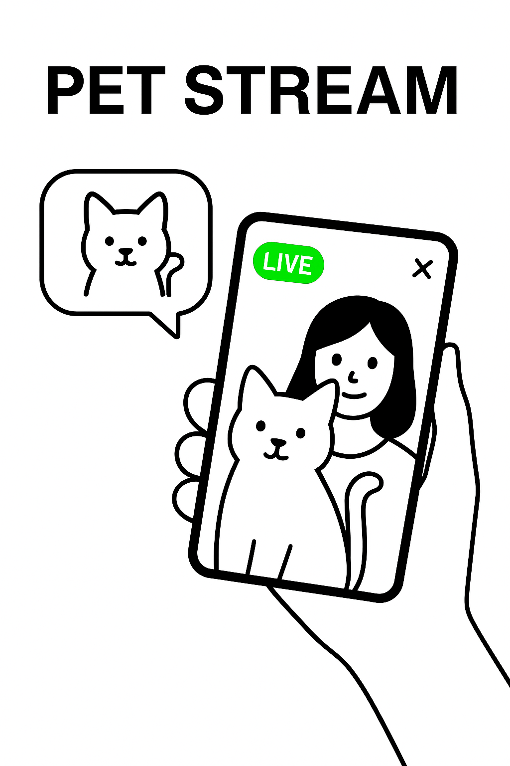 Minimalist illustration depicting a person live streaming with a cat on a mobile device, ideal for promoting pet-related content or services.