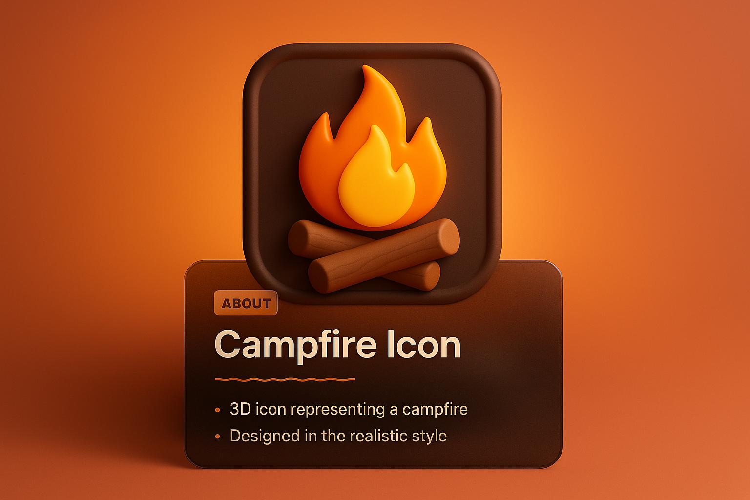 A visually appealing 3D icon of a campfire featuring flames and logs, set against a smooth gradient background. The design includes a dark overlay with descriptive text.