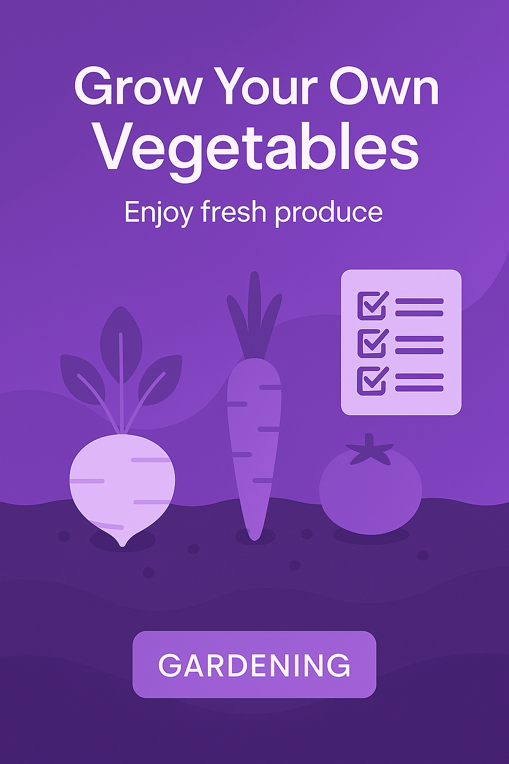 Vibrant digital graphic promoting vegetable gardening with simple illustrations and a checklist theme, ideal for gardening enthusiasts and eco-friendly living content.