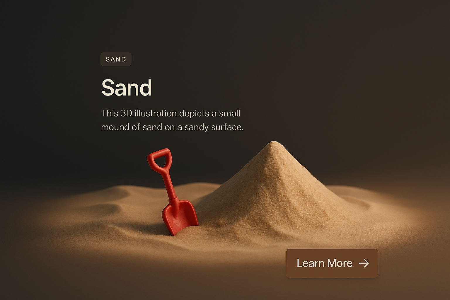 /Collection: /by davooda/Type: PNG/This image showcases a realistic 3D scene of a small mound of sand with a red shovel, set against a dark gradient background. The design emphasizes a zoomed-out perspective.